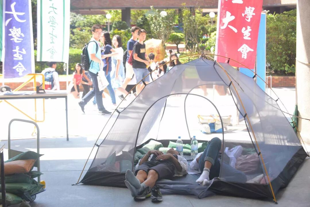 5日晚,学生会在校园内搭起两个帐篷,会长林颖恒及评议会主席阮柏喨开始绝食抗议,要求校方安排公开会面,解释收回民主墙原因。
