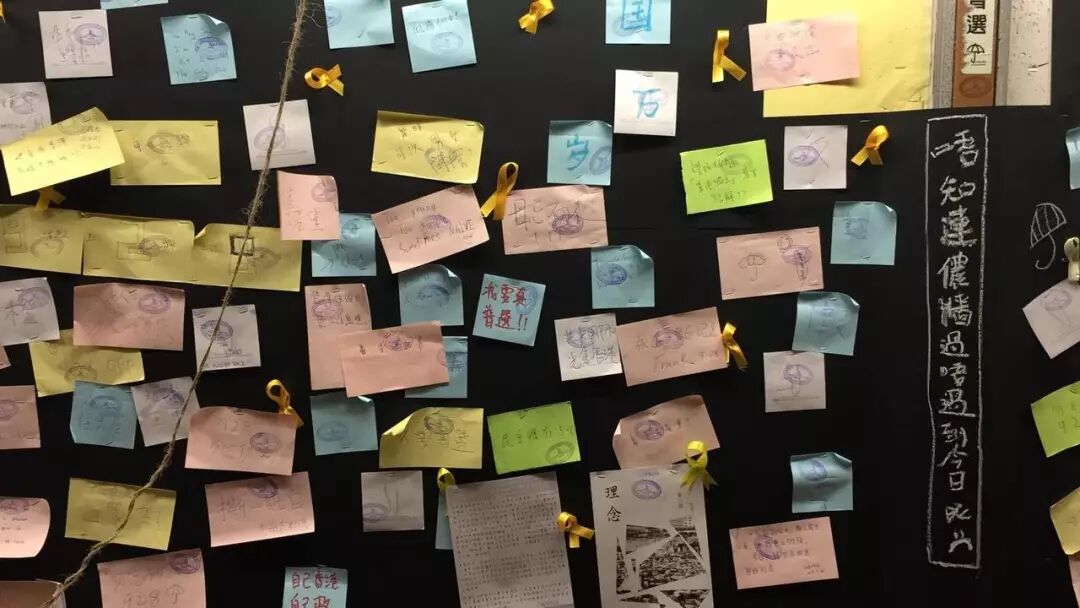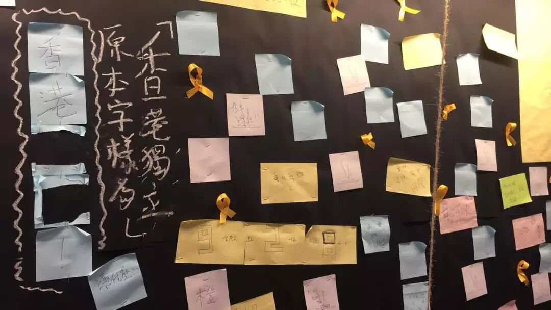 这些贴在墙上的便利贴有几十张写有不同政治诉求,包括“我要真普选”“守护言论自由”等等,更有人贴出“香港独立”四字。
