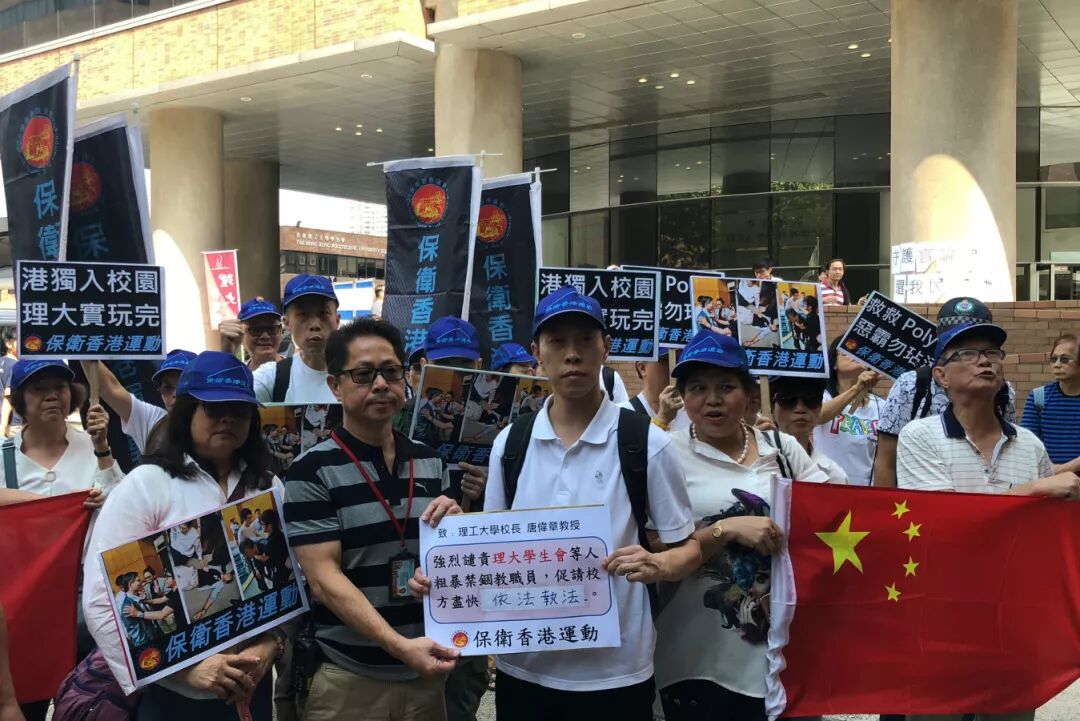 另外有团体『保卫香港运动』到理工大学游行抗议,促请校方依法惩处用暴力禁锢学校职员的学生,并警惕“港独”势力进入校园。