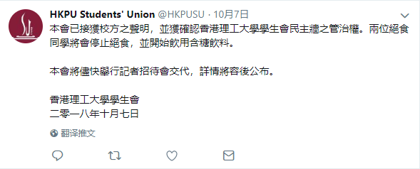 在绝食约18小时后,林颖恒周六(6日)下午会见传媒表示,除非校方归还民主墙管理权和确立学生会自治权,否则不会结束绝食。