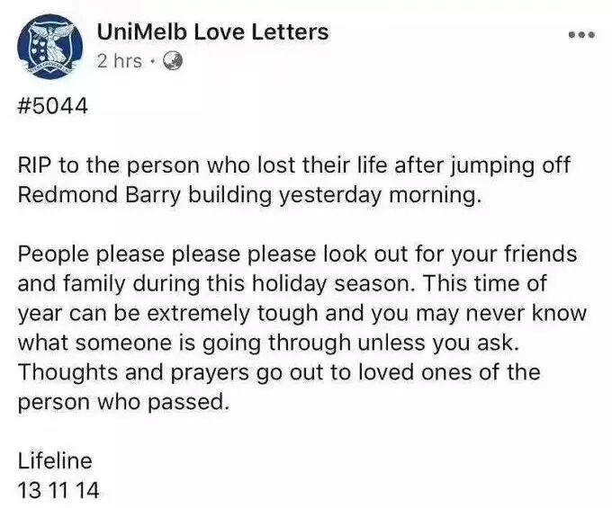 墨尔本大学已经在官方Facebook上确认了此事:也证实了跳楼的学生已经身亡。疑似因为最近考试出成绩,压力太大。