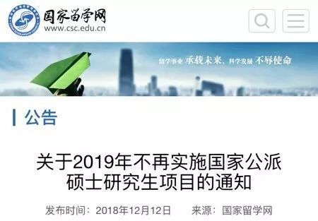 近日CSC官网发布正式公告:2019年不再实施国家公派硕士研究生项目!
