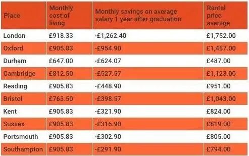 ■ 这份排行榜出自英国Propillo.com网站,它的诞生方式是比较英国各大城市的大学生“大学毕业一年后每月存款额”。