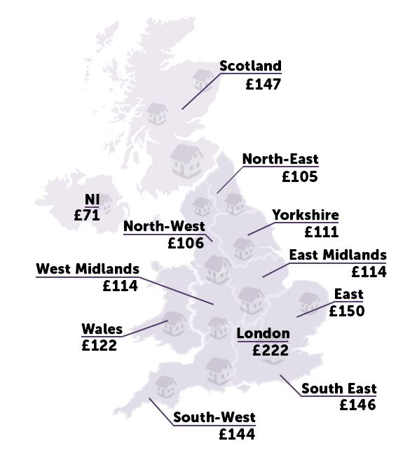 伦敦的房租是最贵的,平均高达£222/周。经济条件有限的同学可能更喜欢北爱尔兰,在这你还能讨价还价,最划算的情况是拿到伦敦租金的1/3——£71/周。(虽然实际情况中大多数留学生都是住在伦敦的…)