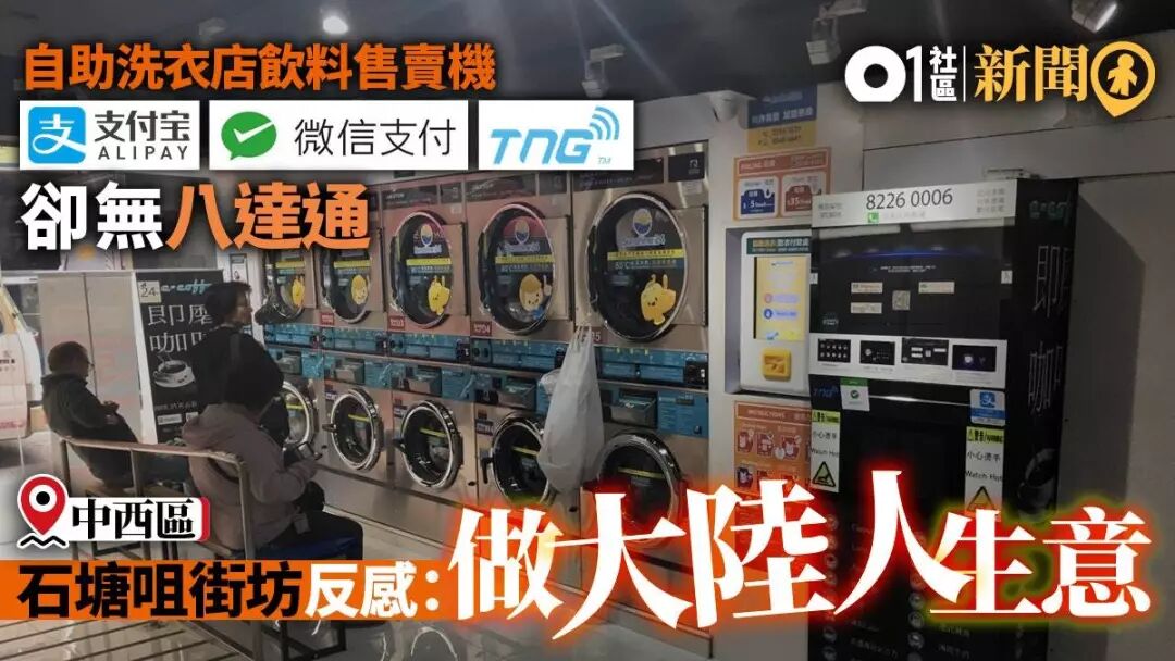 传统旧区石塘咀近月新开一间自助洗衣店,店内更放置一部自动售卖机为客人提供饮料,但机器只接受以电子形式包括支付宝、微信和TNG(香港公司推出的一款电子钱包)付费。