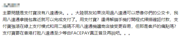 还有一些网友认为,港人最习惯的八达通门槛高,要收取手续费,有竞争是好事,有竞争才会进步;但也有网友认为这很麻烦,八达通更便捷,而且如果需要特地为此而安装程序会感到抗拒。