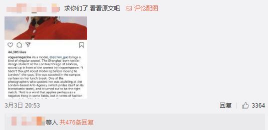 等我再仔细看了内容之后才发现,原来这是两件事,ZARA换成了VOGUE,模特李静雯换成了Qizhen Gao。外国时尚大牌又一次“歧视亚裔”了。