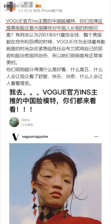 随后有国内大V搬运了这张照片,说这是“主推的中国脸模特”,并以小甜甜布兰妮的例子说明外国人是有正常审美的,却在推中国或亚裔模特时,总喜欢用远离主流审美标准的脸来代表,问网友这是“高级脸”还是“刻板印象”?