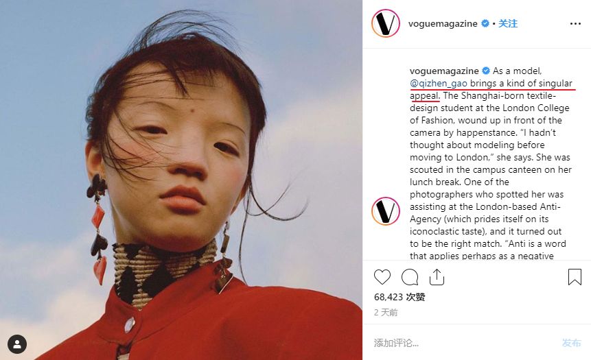 而且Qizhen也并不是所谓的“主推的中国模特”。Vogue对于这张照片的描述,也是完全不带有民族色彩的,因为能够体现他们的时尚主张,所以才放出这张照片。