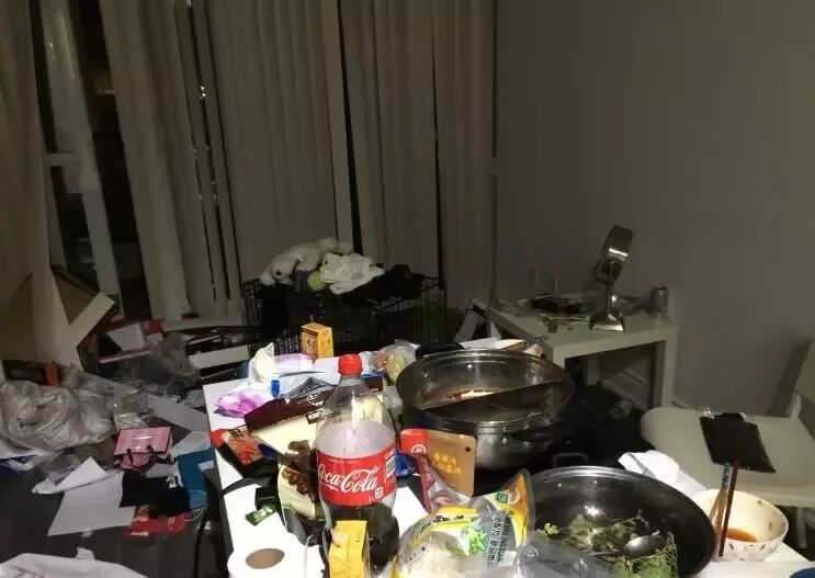 房间里全是垃圾,包括没吃完的食物,都原封不动的摆在餐桌上。