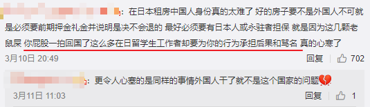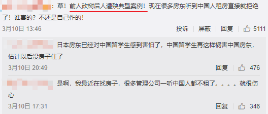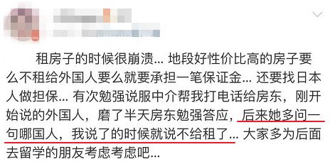 很多中国留学生指出,现在租房越来越困难,既要找当地人作担保人,还要付一笔不菲的保证金,甚至个别地段的房子会标明不租给外国人。再加上已有很多日本房东排斥中国租客,如今连中国的房东也遭到如此对待,恐影响到中国留学生的声誉,往后租房更困难。