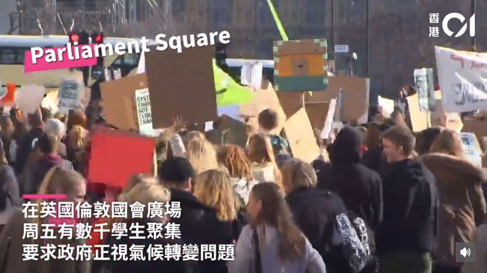 英国共有60多个示威点,数千名学生聚集在伦敦国会广场,这也是英国首次青年气候示威。
