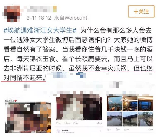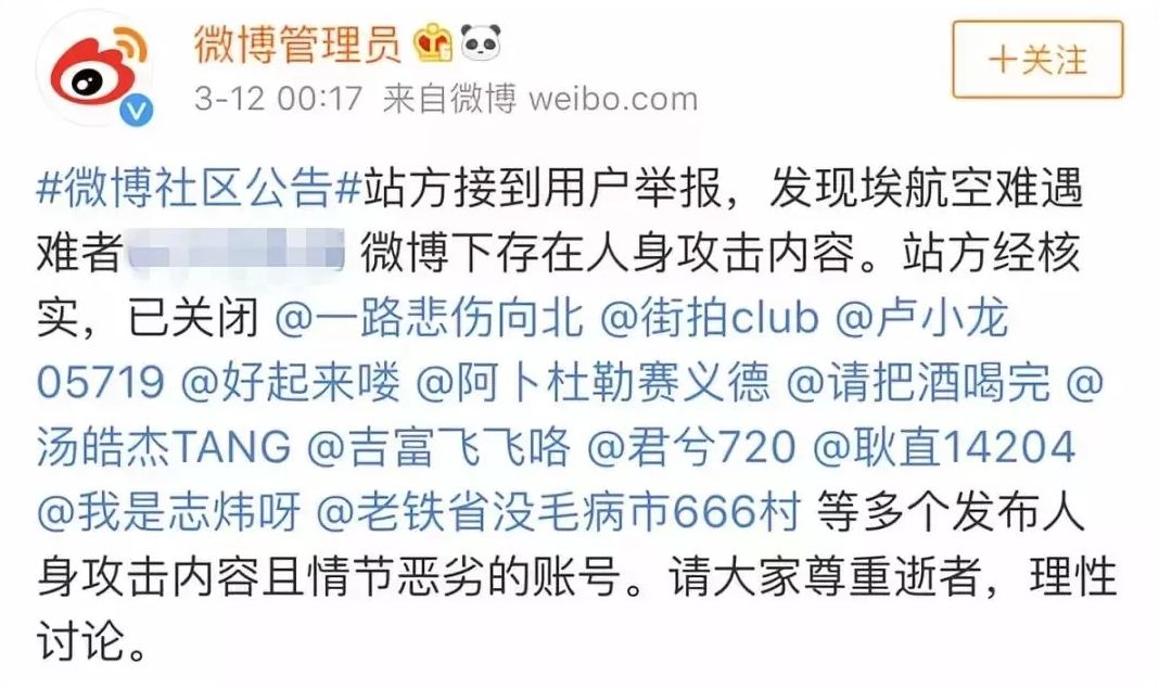 同样在我们国内,值得安慰的是,在三天前,微博管理员已经把人身攻击埃航失事女大学生的微博账号全部封号了。