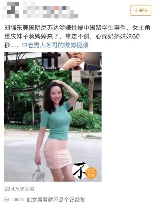 女生的微博瞬间被攻陷,各种讽刺随之而来,可事实上,女生只是一位模特,和刘强东、美国、明尼苏达没有半毛钱关系。