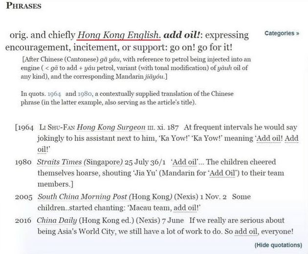 里面将“add oil”解释为鼓励、支持的意思,相当于“go on”或者“go for it”,还标明是港式英文(Hong Kong English),也是非常有排面了。
